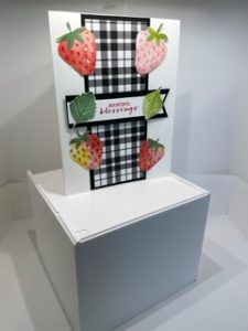 I had sometime ago, cut out some strawberries from the Berry DSP and placed those strawberry cut outs on each side of the plaid rectanglee.