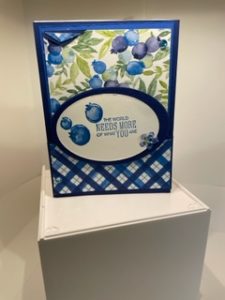 Determined to use before January 1, 2022, I cut a 6″ x 6″ square out of the Berries DSP. I used the DSP that had blueberries on one side and blue plaid on the other.