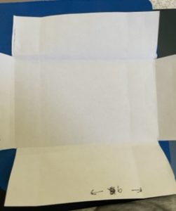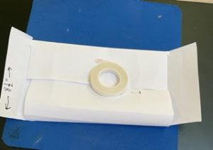 With the 9″ side facing upward and fold the 2″ panel down. Place tear & tape on the edge of this panel. Withe you take-a-pick tool remove the release paper on the tape. Then fold the 2-1/2″ panel at the bottom up onto the panel that has the tear & tape on it.