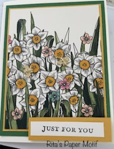 This is an A2 size card featuring the Daffodils and Bee trinkets (155565). The Bee Trinkets are still available in my store. Just click “shop now”.