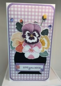 With more of the pansies, I cut from the designer paper I adhered them to the flat side of the circle. I used several pansies so that they looked like they were growing out of the pot.