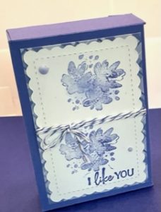 This cute gift box when completed measures 4-7/8″ x 2-1/4″x1″. You can easily tuck several things inside and give along with a card or separately. You can choose what color card stock you want. I used Orchid Oasis #159267. You can decorate front as you like. I used the Flowing Flowers and Orchid Oasis ink #159214 on a basic white piece #159276 of card stock 2-1/2″ x 3-3/4″. I used the Scalloped Contour dies #155560 to decorate the white card. You can change it up however you want.