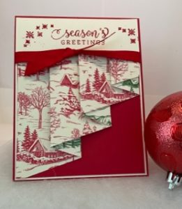 • Now would be a time to stamp your sentiment to the top of the 4-1/8″ x 5-3/8″ piece of card stock. I used Seasons Greeting” in real red ink #147084.