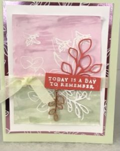 Ink up an acryilic block with ink. With a water painter create water color. Then water color over the embossed images. I water colored the top half in Fresh Freesia and bottom half in Soft Sea Foam. But you can choose different colors if you want. You could also water colors the images only.