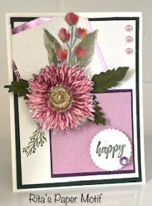I used the Fresh  Freesia Foil from the Splendid Day DSP #159666 as a bottom layer for the smaller white rectangle. Those layers were adhered at an angle at the top of the card. Then two more (slightly larger) rectangles were adhered to the bottom of the card. These rectangles were cut out of Black Berry Bliss  #133674 and Highland Heather #146986 cardstock.
