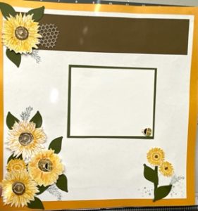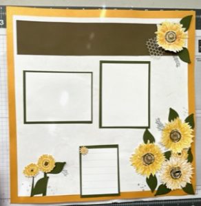 This was the first scrapbook page to a two page layout.  I used the sunflower stamp and the sprig stamp. The sunflowers were stamped in Crused Curry Ink #147087. The middlle was stamped with the middle stamp in Soft Sude ink #147115.  Then I arranged them on the white matted card stock.