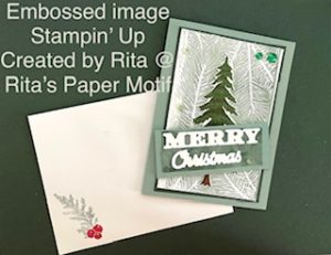 The sentiment strip that measures 1-1/2′ x 3″ was cut from a scrap of Soft Succlent cardstock. An old set of Christmas dies were used to cut out the words “Merry Christmas” out of a scrap of basic white cardstock. They were then addhered to the sentiment strip. The sentiment was adhered to the card using dimensionals.