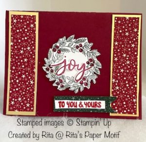 - I also found in my scrap bin, a peice of gold foil cardstock. I cut two strips each measuring 1-1/1″ x 4″. I then adhered the red and gold DSP strips onto the gold foil strips. Then adhered a strip to the left and right side of the card. (The card base is landscape orientation being top folding)