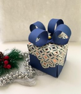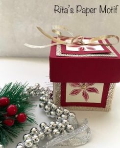 - If you choose to decorate your box like I did in the first picture above, you will need 5 pieces of coordinating paper that measures 2-1/2″ x 2-1/2″. That allows a square for the 4 sides you will decorate and one for the top of the box.