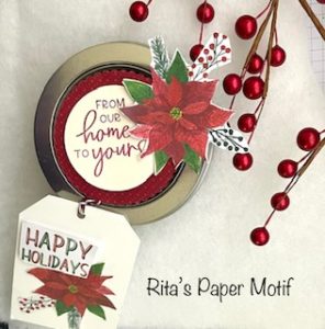 I used my 2″ hole punch to punch a circle out of the Cherry Cobbler Cardstock. I layered a 1-1/2″ circle (Very Vanilla) on top of Cherry Cobbler circle. I used a pointsettia cut-out to decorate. Of course, the tag I attached is from my Christmas tag stash.