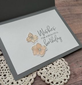 - Adhere the inside panel that you stamped “Wishes for a beautiful birthday” to the inside of your card.