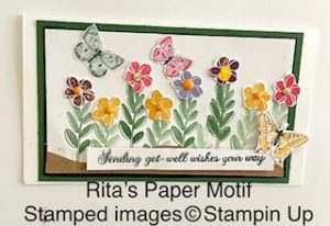 - Now I decided when and how I wanted my stamped flowers to lay on the Basic White panel on the front of the card. I used glue dots to adhere them.