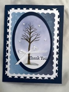 • I used my blending brush to blend (#153611) in Nighty of Navy ink (#147110) on the rest of the oval. I tried to blend so that the Night of Navy color was darker at the top of the oval and lighter downwards. Yes, I blended right over the tree.
