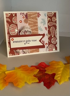 I love this sketch as it allows me to use strips from smaller pieces of DSP while creating an attractive catd. It also is an easy way to make many cards from a 6″ x 6″ or 12″ x 12″ sheet of DSP.an attracti