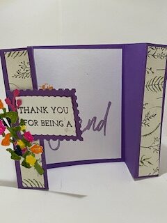 - With dimesionals I adhered the left side of the sentiment to the smallest flap on left side. Make sure the dimensionals sit between the left side of the sentiment and the small left side flap. Otherwise you will cloe your gate fold.