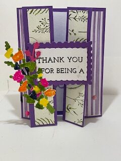 - I cut (2) 1-3/4″ x 5-1/4″ pieces of coordinating DSP (I used Gorfeous Grape and White striped but use what you want.), and adhere to the two remaing front parts of gate.
