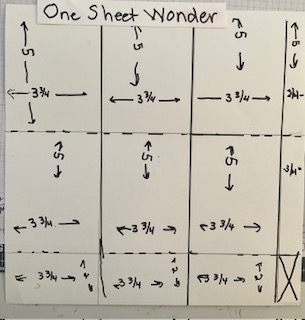 - You should now have 6 panels of 3-3/4″ x 5″, 3 pieces of 3-3/4″x2″ and one strip that measures 3/4″x12″.