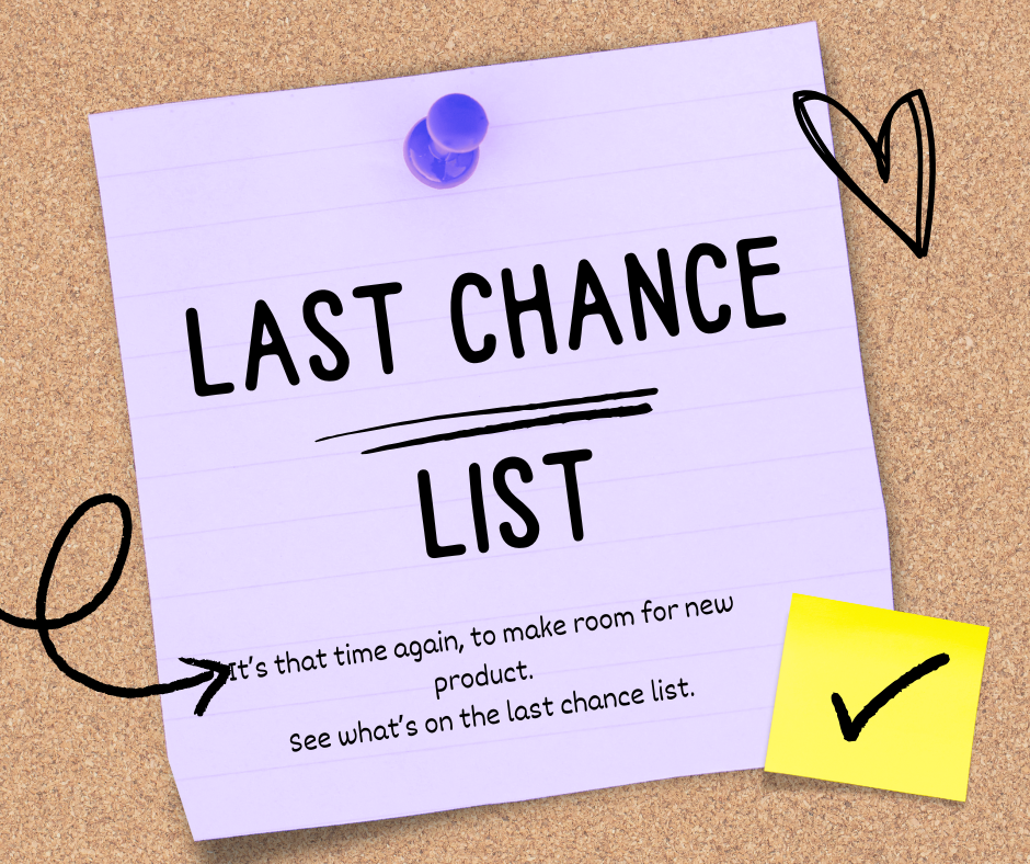 In May 2025, we will begin our new catalog. A new catalog means some new product and to make room for that new product some current product has to move. That current product is placed on a last chance list and is usually marked down. To see that list click on the poster.