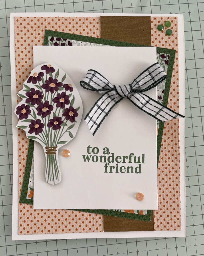 I used scrapes from “To Market” DSP. ribbon, and a sentiment stamp from an old Paper Pumpkin.