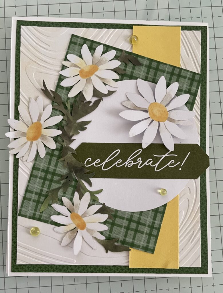 I used an A2 size Basic White card base, a green piece of “To Market” DSP, So Swirly Embossing Folder, another green plaid piece of “To Market” DSP, Daisies from March’s Paper Pumpkin (Daisy Daydream), a circle from Daisy Daydream, the sentiment “Celebrate from The Birthday Mix & Match Combo and some gems from my stash.