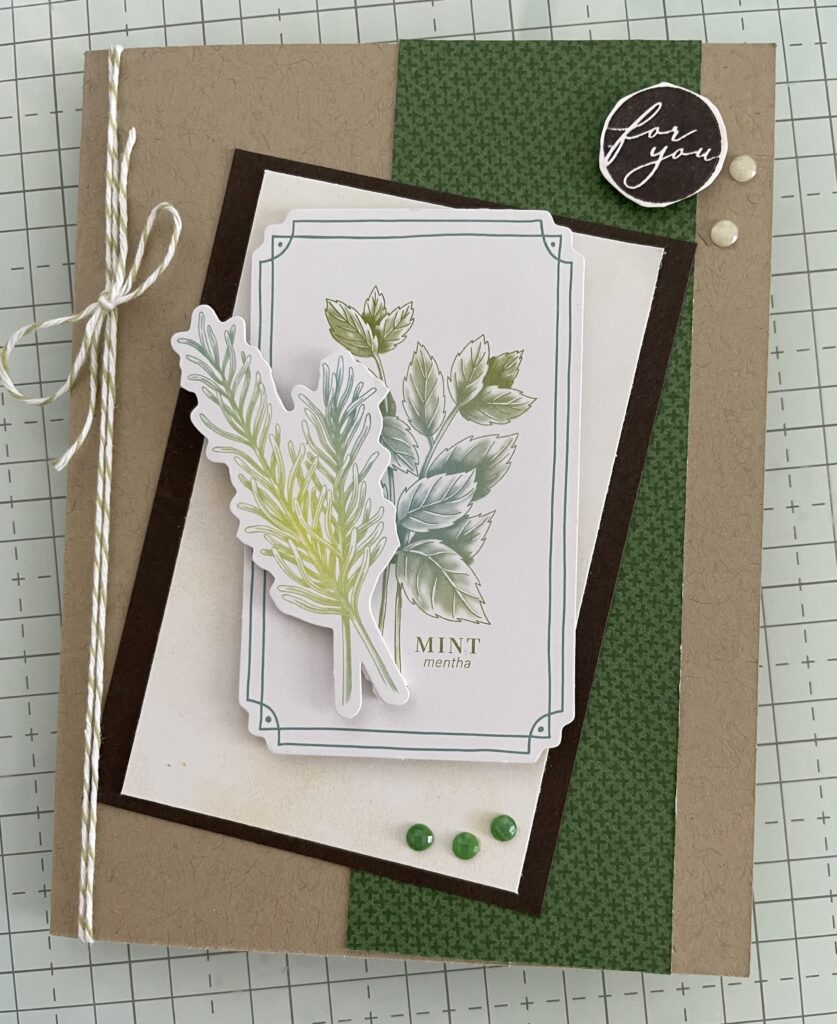 I used an A2 size Crumb Cake card base, a green stip of DSP from “To Market” Designer Series Paper, a 3″x4″ piece of Basic Black cardstock, a 2-7/8″x 3-7/8″ piece of a card base from March’s Paper Pumpkin, and ephemera from the “Hello Spring” Paper Pumpkin. The sentiment at the top right of the card is a stamp from the “Hello Spring” stamp set and the gems are from my stash.