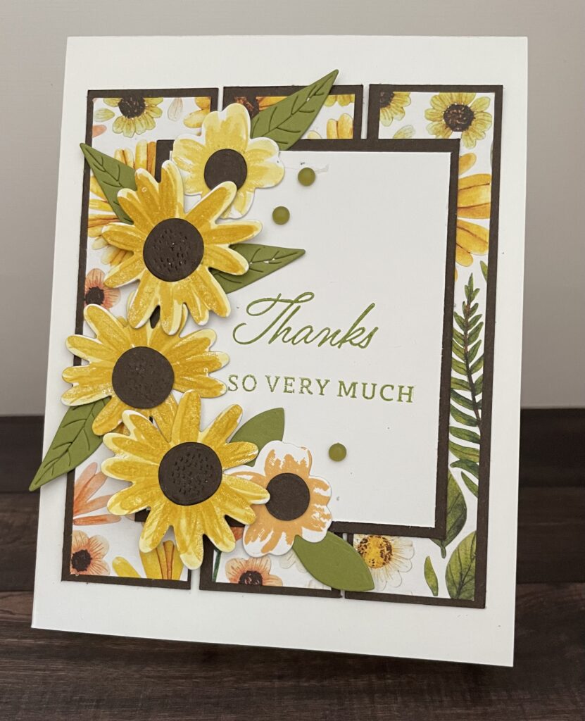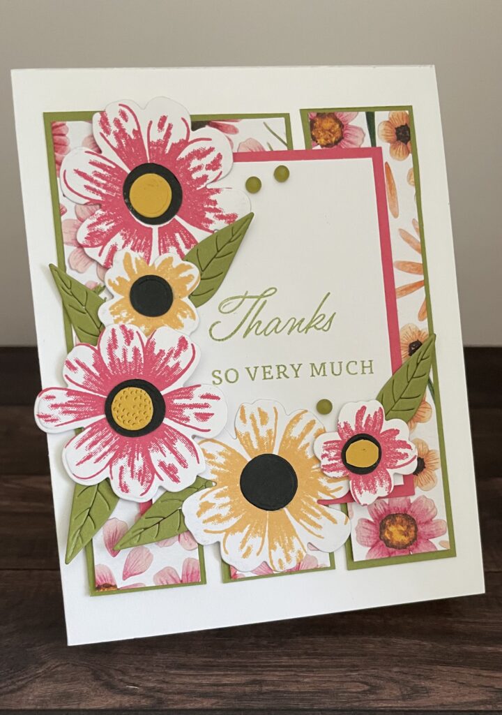 The suite is a bright and cheery meeting of floral products. Our Floral Impressions Suite Collection is a real standout. It gave my cards and scrapbook pages some flower power with bright paper adorned with vibrant flowers. The stamps feature lush greenery and blooms, the dies offer flowers and heartfelt sentiments, and other decorative supplies including an embossing folder provide the opportunity to take my creations to a whole new level.