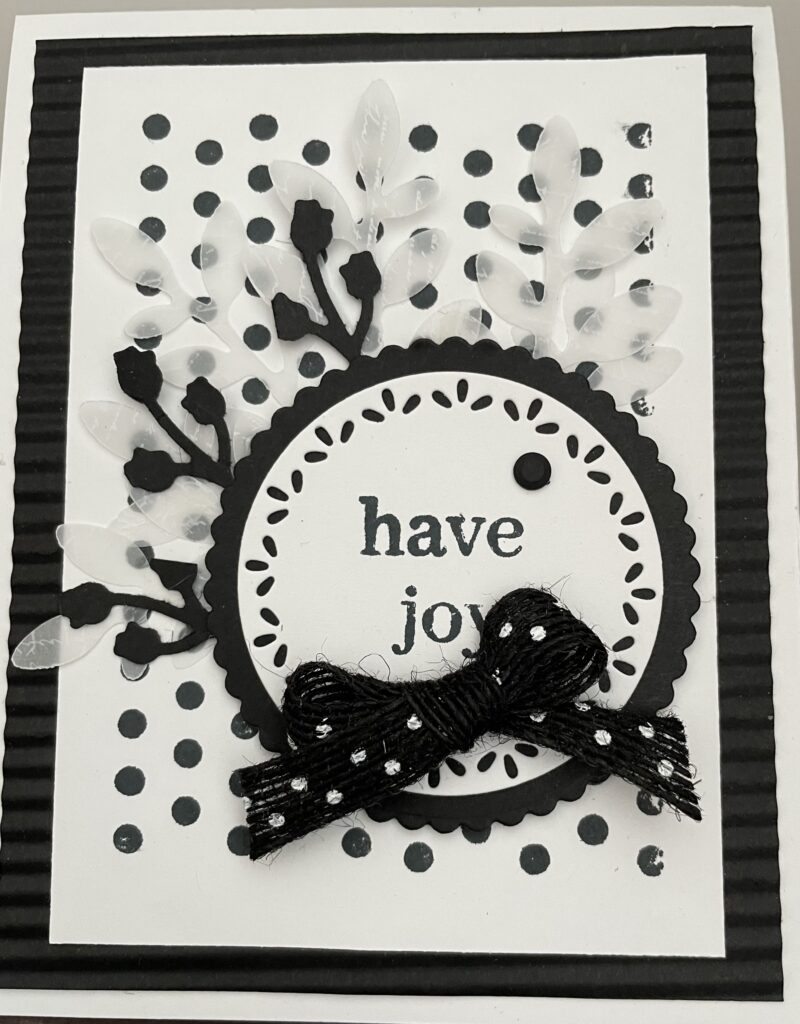 I love this card. The dots give it character, the vellumn gives it pizazz, and the black corrugated layer creates texture.