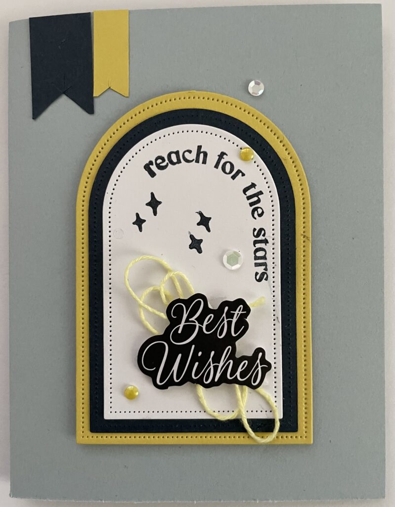 6. With the stamp from the Everyday stamp set stamp in Secret Sea ink the greeting “reach for the stars”. Also stamp a couple sets of the crosses below the sentiment.