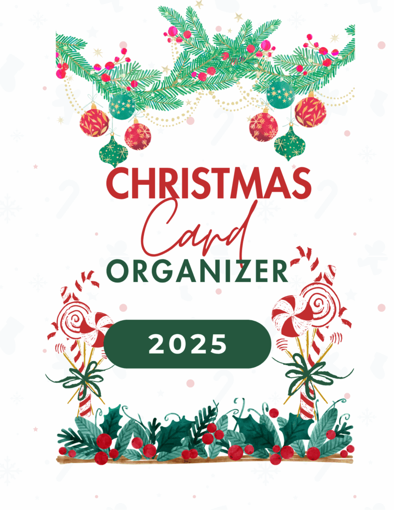 Let’s create a Christmas Card Organizer. This Christmas Card Organizer that you will create with seven sections that will keep you organized and on the timeline so that your handmade Christmas cards will be ready to mail December 1, 2025. These sections can be created with tabs and pockets to hold printable forms. These forms will keep you on a timeline, organized and can be removed to use and updated each year.