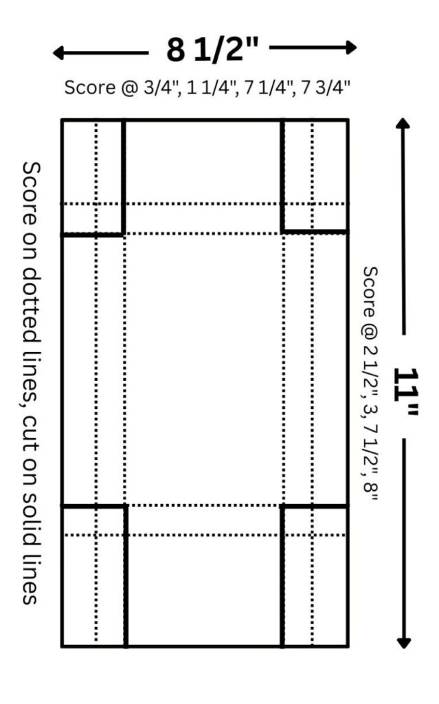 •  With 8-½” side facing up, score at ¾”, 1-¼”, 7-¼”, 7-¾”.