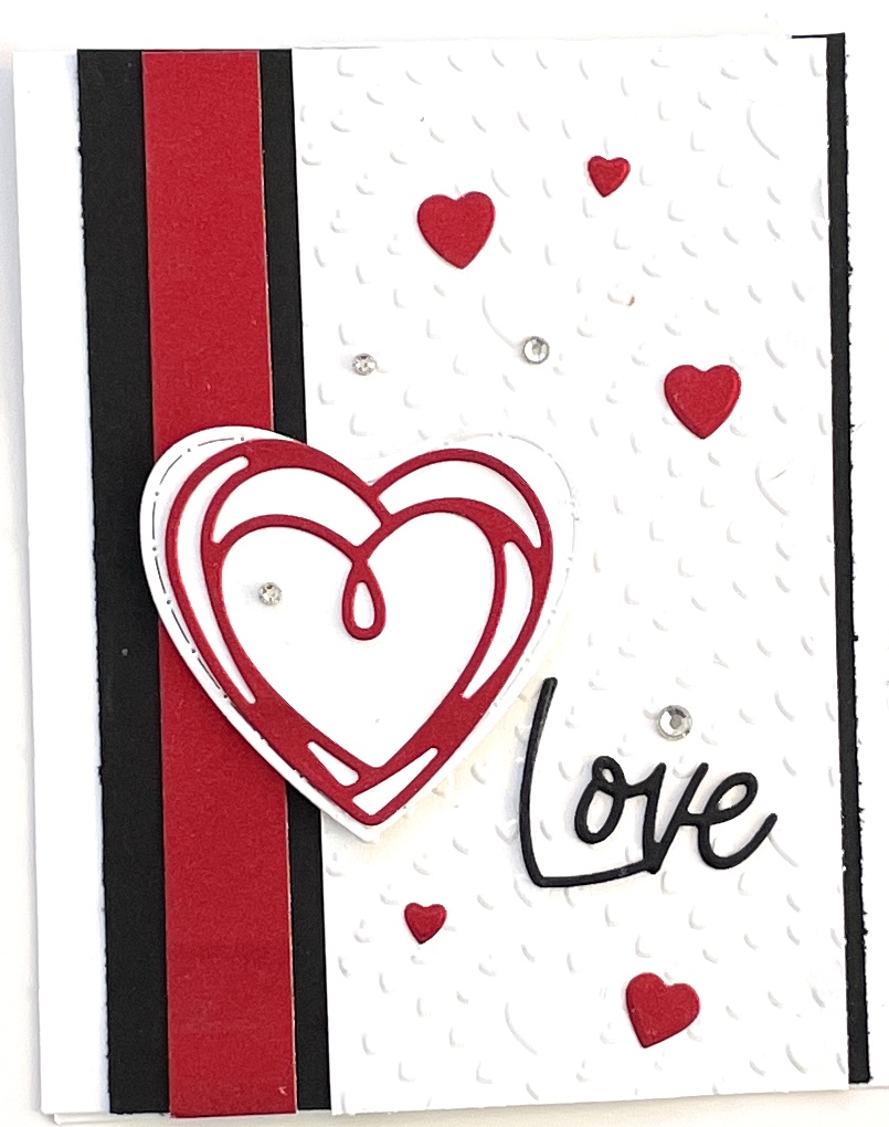 I’ve paired it with a romantic twist using red glitter, bold black accents, and embossed texture. Below is my card.