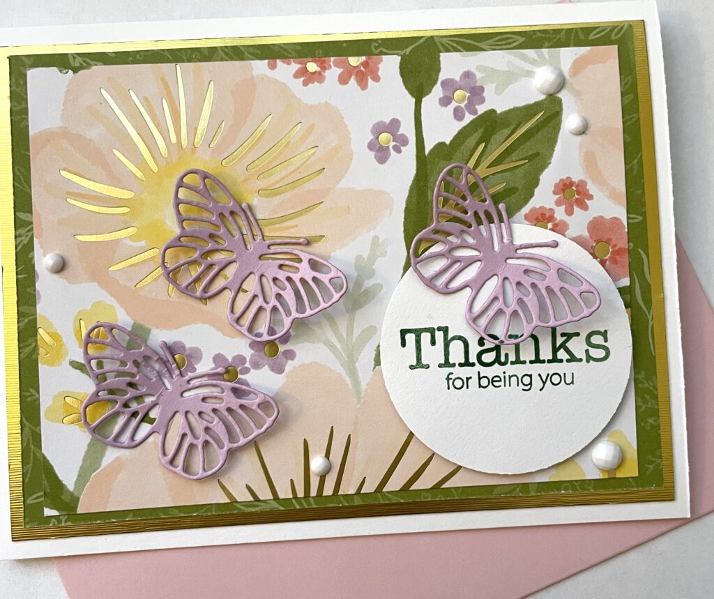 This card is made using some of The Lovely & Beautiful DSP and the ever elegant gold foil. The Fresh Freesia butterflies were inspired by the kit. The sentiment “Thank you” is possible via the Butterfly Garden stamp set from the kit.